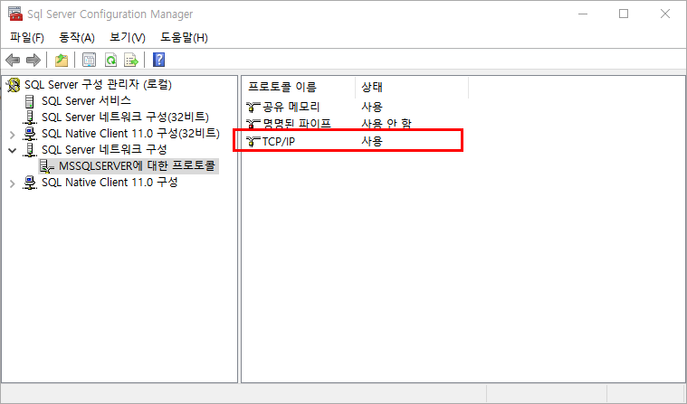 MSSQL서버에서 동시에 두개의 포트를 지정하여 사용하는 방법에 대해 알아보도록 하겠습니다. 기본적으로는 하나의 포트를 사용하겠지만 상황에 따라 두개포트를 사용해야 하는 경우에 유용하게 사용할수있습니다. 1433,14330 포트에 연결하는 방법에 대해 알아보겠습니다. 먼저 SQL구성관리자를 실행후 네트워크 구성 -> TCP/IP부분을 선택합니다.