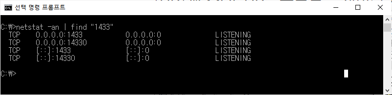 커맨드창에서 포트가 열린것을 확인해보면 1433, 14330포트가 열린것을 확인할수 있습니다.