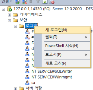 MSSQL서버에서 sa계정을 사용할경우 알려진 계정이다보니 보안에 취약합니다. sa계정을 대체하는 시스템관리자(sysadimn) 계정 생성방법에 대하여 알아보도록 하겠습니다. 먼저 보안 -> 로그인 -> 새로그인항목을 선택합니다.