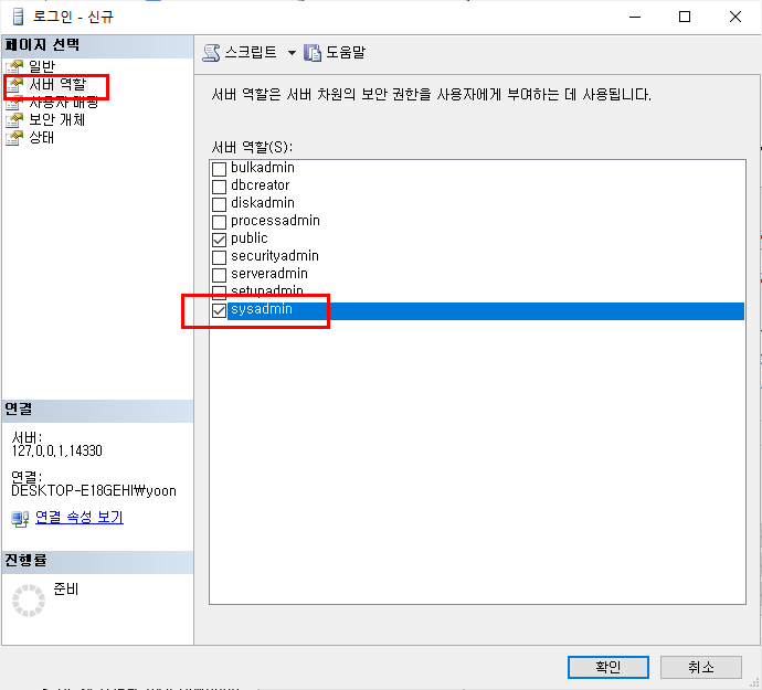 서버역할 항목을 선택합니다. 해당항목을 선택하면 아래 그림과 같이 나타나며 sysadmin 항목을 체크합니다. 이제 해당계정을 관리자 계정으로 사용할수 있으며 기존 sa계정은 삭제하면됩니다.
