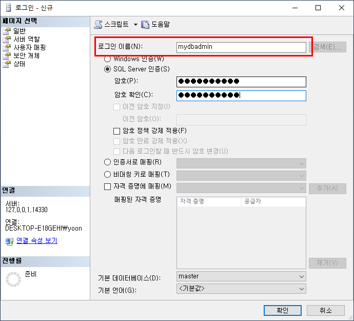 로그인 이름에 신규 생성할 계정명을 입력합니다.