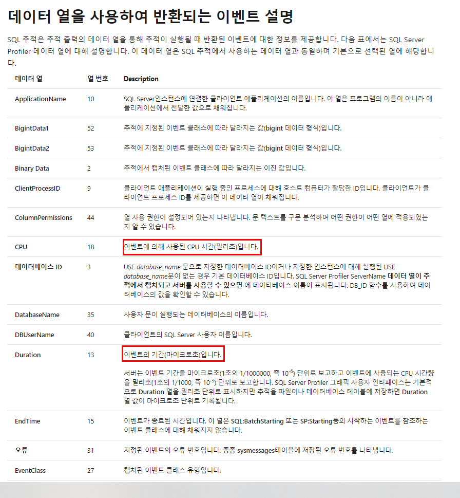 MSSQL의 프로필러로 추적을 할경우 열의 항목에서 나타내는 부분은 아래와 같습니다. 그중에 처리시간과 cpu시간에 대하여 표현하는 단위가 아래와 같습니다.
