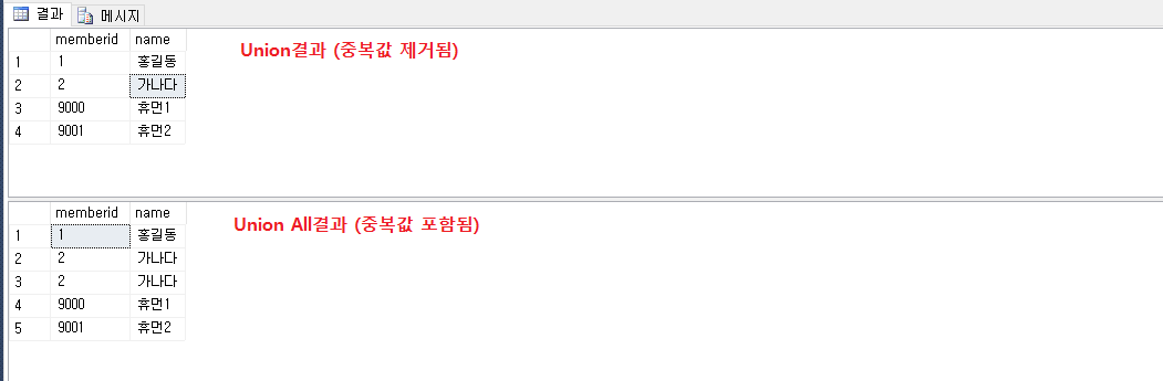 Union은 중복이 제거됨, Union All은 테이블을 있는 그대로 연결해주며 중복값도 표출됩니다.