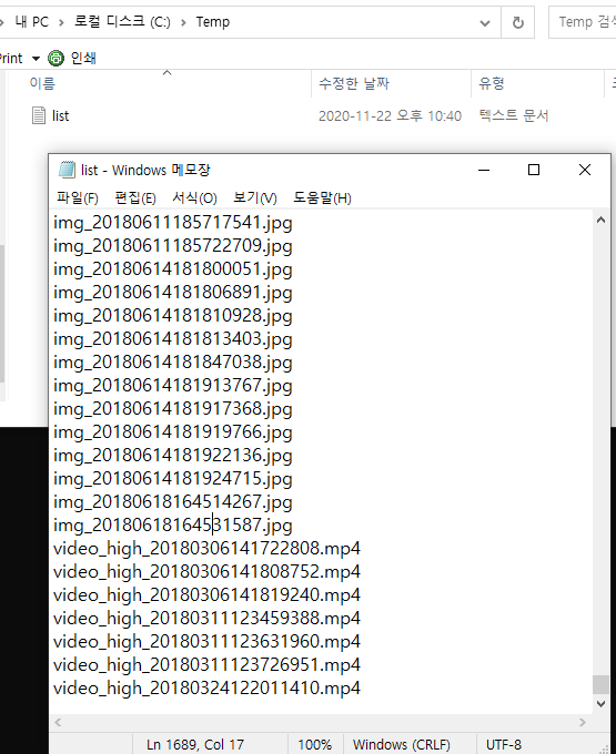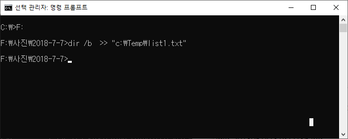 파일로 내보내기 하는 방법은 아주 간단합니다. dir명령을 사용하여 폴더리스트를 리다이렉션 명령어를 이용하여 저장하면됩니다.