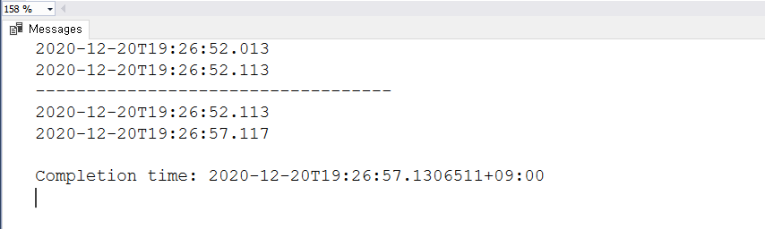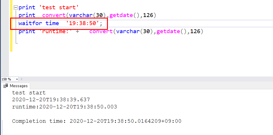 밀리세컨드단위와 초단위로 딜레이를 줘보겠습니다. waitfor dealy '0:0:0:100' 으로 실행한것을 볼수 있는데 '시:분:초:밀리세컨드' 형식으로 딜레이를 주는것을 볼수있습니다.