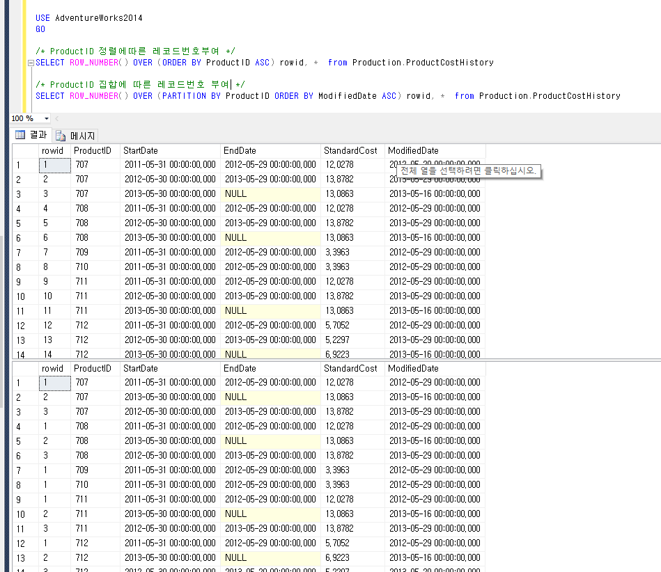 | ROW_NUMBER() OVER (PARTITION BY ProductID ORDER BY ModifiedDate ASC) 특정필드에 대한 그룹을 두어 레코드번호를 부여 |