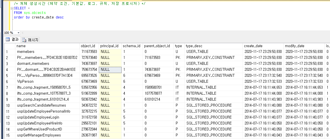 /* 개체 생성시간 (제약 조건, 기본값, 로그, 규칙, 저장 프로시저) */