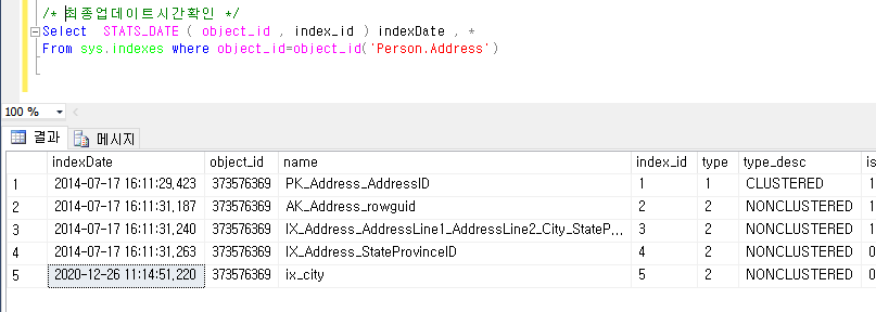 인덱스 최초생성시간은 확인할수 있는 방법은 없습니다. 혹시나 알고계신분은 댓글 남겨주시면 감사하겠습니다. 최초생성시간을 확인할수 없으나 가장 최근에 업데이트된시간은 STATS_DATE ( object_id , stats_id )을 사용해서 확인이 가능합니다. STATS_DATE : 테이블 또는 인덱싱된 뷰의 통계에 대한 가장 최근의 업데이트 날짜를 반환합니다.