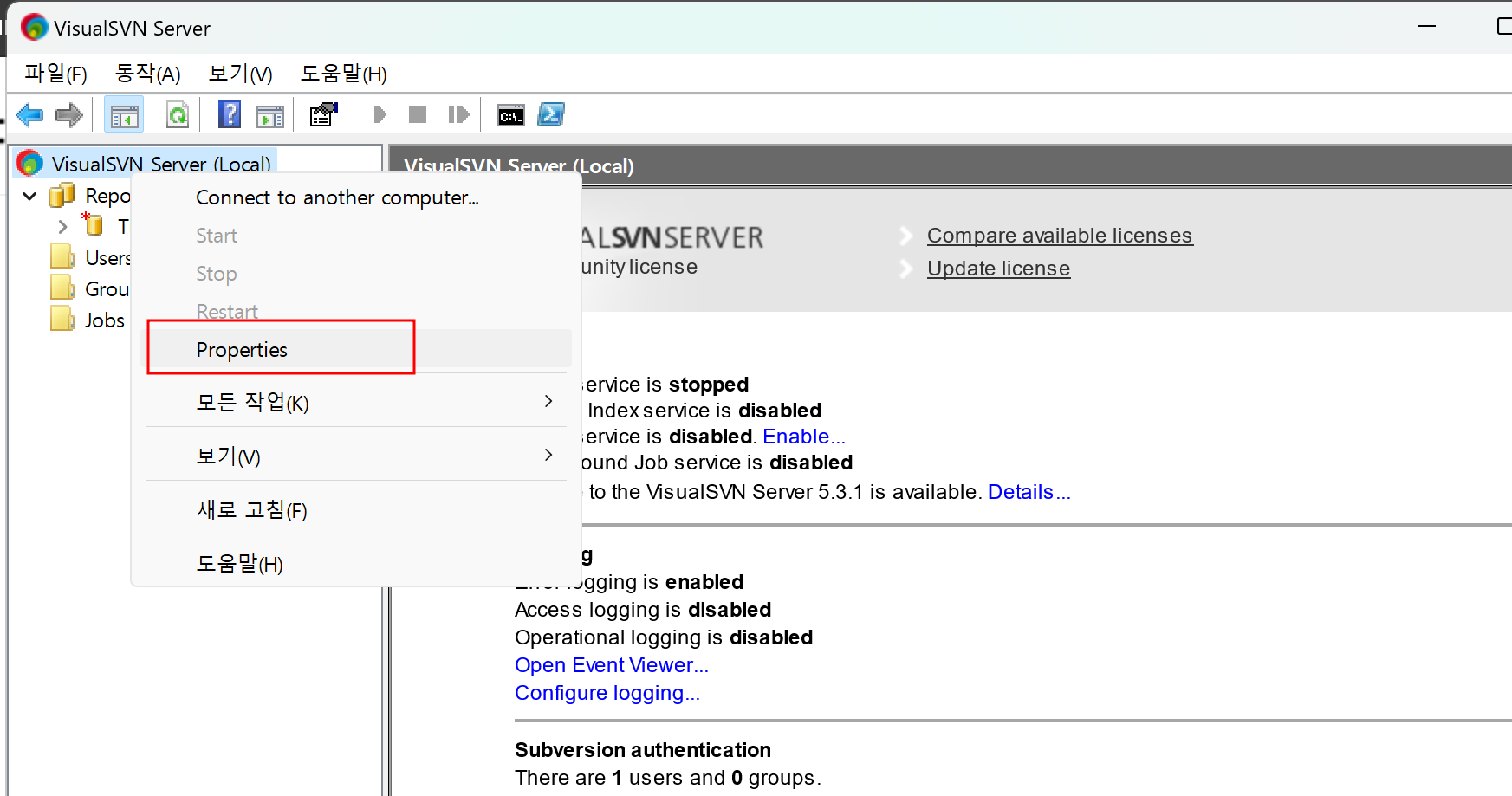 SVN저장소의 경우 기본 8443포트를 사용합니다. 해당포트를 다른 서비스에서 사용하는 경우 포트를 변경해야되는 경우가 있습니다. 포트번호를 변경하는 방법에 대해 알아 보겠습니다. VisualSVN Server를 설치하면 아래와 같이 관리자 툴이 나오는데 해당 부분에서 VisualSVN Server항목에 마우스 우클릭 후 Properties를 선택합니다.